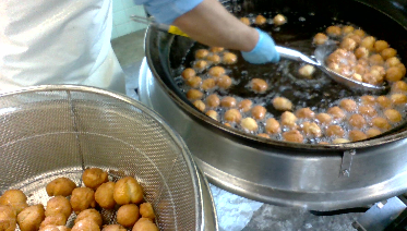 朝から粉をふるって溶かしバターやおから、豆乳などと混ぜてディッシャーで形を作り、揚げました。