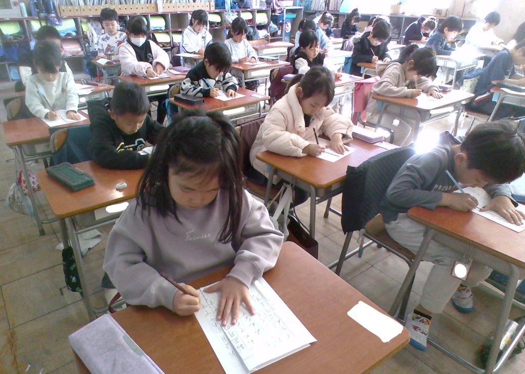 1学期、2学期と、ひらがなやカタカナ、漢字といった様々な文字を習った1年生。学んだことを活かして、字の形や「とめ」「はね」「はらい」に気を付けながら丁寧に書きました。