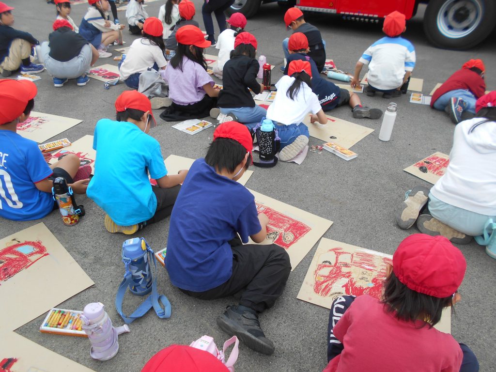 1年ぶりに目の前で見る消防車に、大喜びの子供たち。大きな画用紙いっぱいにクレパスを使って描きました。細かい部分までよく見て、「これは何ですか?」と消防団員の方に質問をする姿も見られました。