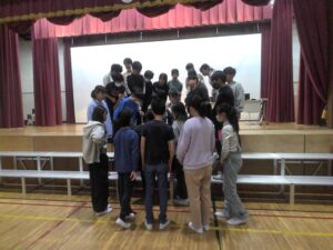 「演技する場所を広く使ってみよう。」「セリフの掛け合いをゆっくりしてみたらどうかな。」と声を掛け合いながら、